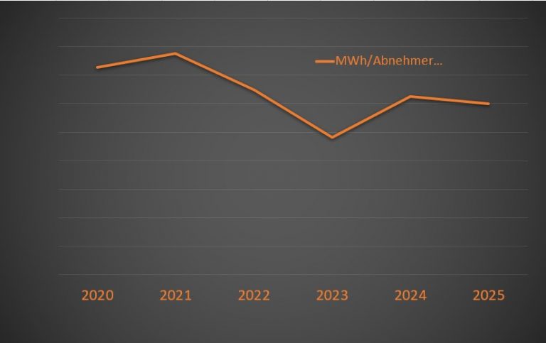 Wie der nebenstehenden Grafik zu entnehmen ist, war der durchschnittliche Wärmebedarf 2024 höher als 2023. Für die Auswertung wurde die erzeugte Wärmemenge in´s Verhältnis zu den jeweils zu Jahresende erfassten Wärmeabnehmern gesetzt. Die Auswertung ist daher als Näherung zu betrachten.